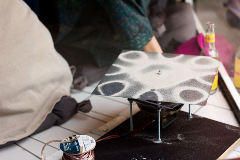 Wir haben eine Chladni-Platte aus einem alten Lautsprecher und einer Metall-Platte gebaut. Die Muster sind abhängig von Material, Form und Dicke der Platte.